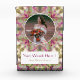 Bloc photo personnalisé de mariage avec étoile verte rose violette pêche. Personnalisez-le en ajoutant votre propre photo et vos propres mots. Un motif géométrique moderne en couleurs chaudes rose, violet mat et vert olive doux en forme d'étoile entoure la photo de la mariée, du marié ou du couple heureux. Un cadeau personnalisé à l'esthétique féminine et girly pour décorer votre salon fantaisiste, votre chambre bohème ou votre bureau éclectique. Célébrez le plus beau jour de votre vie en capturant vos précieux souvenirs de famille heureuse avec ce souvenir. En fait un excellent cadeau pour un anniversaire ou pour les parents des jeunes mariés également.