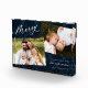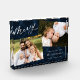 Elegant holiday photo block featuring "Merry" in a modern white calligraphy script on a painted navy blue plaid background. Personalize Christmas photo block by adding two of your favorite photos, greeting, name, and the year.