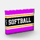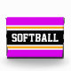 Cette conception sportive et sportive présente un texte SOFTBALL audacieux à l'intérieur d'une large bande noire centre surlignée avec des rayures blanches et jaunes contre des rayures extérieures tropicales vives et roses. Le texte peut être personnalisé.