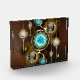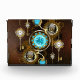 Turquoise lenses with antique watch with brass gears and golden keys on rusty, brown background. Steampunk style.