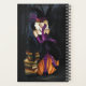 Une sorcière blonde assise sur un grand citrouille orange. A ses côtés, un chat à bille est assis sur un tas de livres. Derrière se trouve une forêt et un château.
