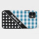 Moderne rencontre le Coque iPhone 5 d'inspiration champêtre conçu avec un motif bleu & blanc en vichy sur le dessus, un motif pois noir & blanc sur le fond, et personnalisé avec votre nom ou texte personnalisé en blanc sur une bande noire diagonale.