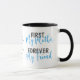 Voici une tasse pour maman pour la fête des mères qui va tirer sur ses cordes de coeur ! Le texte sur les deux côtés est en bleu pastel doux et noir, et dit "D'abord ma mère, Forever mon ami". Votre texte personnalisé est au milieu dans 4 champs faciles à changer, donc vous pouvez aussi faire un cadeau d'anniversaire. Elle va l'adorer !