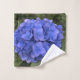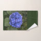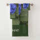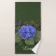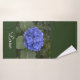 Gros plan d'hydrangée bleue avec de grands feuilles verts. La serviette plus grande a une bordure verte sur le dessus et le bas avec le mot Amour écrit en écriture blanche. Bordure verte au-dessus du fond de l'image florale. Photographie originale de TamiraZDesigns.