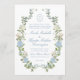 This elegant wedding invitation features a custom monogram crest with a border of beautiful watercolor blue-and-white hydrangea blooms and sage greenery, creating a soft and inviting look. The timeless artwork offers a romantic, polished look ideal for formal or coastal weddings. Add custom text to create a stunning floral wedding invitation that your guests will love.