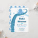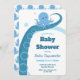 A baby shower invitation with a smiling, blue, octopus character. The little octopus is being held up by the arm of a larger octopus. The back of the invitation shows a pattern of little octopuses. All of the words can be customized.
