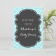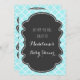Invitations de douche bébé personnalisées dans élégant et moderne bleu ciel aqua clair, gris fusain foncé et blanc motif quatrefoil avec jolie apparence vintage tableau noir. Personnalisable avec votre texte, contactez-nous pour demander un changement de couleur.