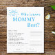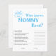 Préparez-vous à vous amuser avec notre Blue "Who Knows Mommy Best" Baby shower Game, une façon délicieuse de tester la connaissance de vos invités sur la future maman! Dans ce jeu, les invités répondront à des questions sur la future mère, comme sa nourriture préférée, sa date d'échéance, ou ses envies. Celui qui a les réponses les plus correctes gagne un doux prix ! Conçu avec de charmants accents bleus et des détails de coeur adorables, ce jeu ajoute une touche de douceur à vos festivités de baby shower. Il est parfait pour impliquer les invités et créer des rires et des souvenirs ensemble.