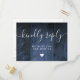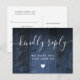 Carte RSVP en bois de grange bleu rustique avec typographie chic. L'inverse vous donne vos détails et une demande amusante de chant invité. Conçu par Thisisnotme©