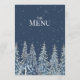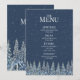 A rustic winter wedding menu with a beautiful snow covered evergreen forest at night in dark navy blue and white.