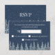 Winter wedding RSVP cards with a rustic night snow covered forest in navy blue and white. Customizable with your wedding details, available in many matching wedding products.