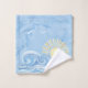 Serviette de bain côtière chic et tamisée, dans des bleus subtils et des vagues d'aquarelle graphique, rythmées par les rayons jaunes et oranges du soleil. Tandis que les mouettes blanches naviguent dans un ciel d'aquarelle.