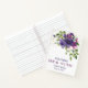 Voici un joli carnet qui fait un joli livre d'or sur la douche nuptiale. L'avant a une étonnante aquarelle d'un bouquet de rose sauvage dans les tons bleu, violet, rose pâle et vert. L'image est placée contre un arrière - plan de confetti en or. En bas se trouve votre texte personnalisé en bleu et en violet correspondant. L'arrière du carnet a la même image florale et confetti sans le texte. Ce carnet correspond à la ligne de mariage Rose Violet Bleu dans notre magasin.