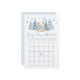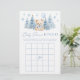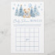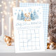 Jeu classique sophistiqué "Bingo" conçu pour une douche pour bébé garçon, orné d'un charmant ours en peluche portant un joli arc bleu, tenant un ballon bleu, entouré de pins et de flocons de neige. Engagez vos invités avec ce jeu délicieux, parfait pour ajouter du plaisir et de l'excitation à votre fête d'hiver tout en créant des souvenirs chéris.