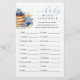 Apportez une compétition ludique à votre célébration avec cette carte de jeu Baby shower Word Scramble. Doté d'une cheminée d'aquarelle de crêpes aux bleuets et aux fines fleurs bleues, ce jeu invite les clients à démêler les mots liés à la douche et au bébé. Le premier à les compléter tous gagne un prix! Amusant, interactif et parfaitement adapté à votre décor de baby shower de brunch aux bleuets. Ce jeu comprend les mots suivants pour se démêler : 1. lait, 2. couverture, 3. fauteuil à bascule, 4. lit, 5. couche, 6. douche, 7. sucette, 8. canard en caoutchouc, 9. hochet, 10. bib, 11. cigogne, 12. poussette, 13. pépinière, 14. jouet, 15. 16. siège auto, 17. formule, 18. costume corporel, 19. bébé, 20. bouteille