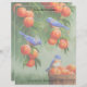 Deux bleuets de l'ouest perchent dans un pêcher tandis qu'un troisième bleu est assis sur un panier en bois tressé rempli de fruits frais récoltés prêts à être commercialisés. Accentué par un arrière - plan à motifs bleus assorti.