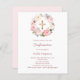 White background, decorated with watercolored pink and white flowers in a wreath and a golden cross. Personalize and add a name and details.