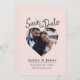 Blush pink photo modern script save the date card featuring a centered heart-shaped photo, soft blush pink background, and gray script headline. This design highlights your engagement photo while clearly presenting names, date, and location in a warm, balanced layout that feels both romantic and modern. Ideal for weddings, engagement celebrations, destination events, or vow renewals where a classic printed announcement is desired. Easily personalize with your details.