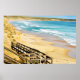 La photo offre une vue splendide sur une promenade en bois qui mène au sable doré en contrebas avec des eaux marines bleu marine qui tapissent le sable