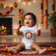 Le 1er Diwali du bébé. Rangoli coloré avec une lampe à huile appelée Diya. Les lampes sont allumées à Diwali parce que l'existence de la lumière signifie l'absence d'obscurité et de forces diaboliques. Le Rangoli est traditionnellement dessiné avec les doigts en utilisant de la farine, des grains de riz ou de la craie colorée. A Diwali, les Hindous attirent de brillants motifs Rangoli pour encourager la déesse Lakshmi à entrer dans leurs maisons.