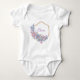 Ce bodysuit précieux pour bébé fille est doté d'un double cadre en filigrane doré avec un bouquet floral de fleurs violettes et bleues peintes à l'aquarelle. À l'intérieur du cadre, vous personnalisez avec le nom de votre bébé fille.