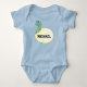 Bébé adorable Brachiosaurus Dinosaur vient de naître. Un joli dessin le montre en train de sortir la tête d'un oeuf. Le nom de l'enfant est écrit dans un texte de type dinosaure noir qui peut être modifié pour convenir à un nom personnalisé pour un enfant. Disponible en nouveau-né jusqu'à 24 mois. Autres couleurs à choisir ! Celui-ci montre la couleur bleue "garçon", mais il est aussi disponible en rose.