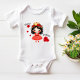 Jolie petite princesse avec des roses rouges, robe rouge et cheveux noirs