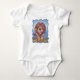 Animal Parade Lion Cute Baby Jersey Bodysuit est pour le côté amusant de vous mettant en vedette notre art original d'un personnage de lion mignon peint par notre talentueux artiste pour enfants, Traci Van Wagoner. Voyez le lion fantaisiste venir et aller avec cette oeuvre amusante du roi amusant de la tête de la jungle sur le devant et la queue du lion africain sur le dos contre un arrière - plan bleu texturé avec une bordure violette ondulée ludique. Rugir!