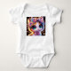 Un design de bodysuit pour bébé fantaisiste et adorable représentant un chat mignon orné d'une couronne de fleurs colorées sur un ciel nocturne étoilé. Le design ludique et les couleurs douces créent une atmosphère magique et enchanteresse.