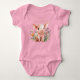 Un body bébé cochon mignon pour un nouveau-né fille, ou enfant de tout âge. Un heureux bébé cochon est assis parmi de jolies fleurs sauvages dans ce design. Ajoutez le nom de l'enfant en haut en lettres ombrées. Illustré sur un tee-shirt rose, avec d'autres couleurs disponibles. Si vous choisissez une couleur, sélectionnez la couleur de base pour de meilleurs résultats. Le design se transfère facilement à n'importe quelle autre taille et style de haut.