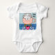 Costume de bébé fille avec chat souriant dans une tasse de café avec un coeur et tourbillonne. Le chat est gris, la tasse est rayée orange et l'arrière - plan est bleu. Les mots sur le costume peuvent être changés en nom de bébé. Merci à Creative Fabrica pour certains des éléments du design.