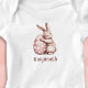 This baby bodysuit features a cute baby bunny hugging a mauvy pink easter egg with white polka dots. Your child's name appears in charming lettering underneath the rabbit artwork. This is a great design for Easter but would be a cute design on other spring days.