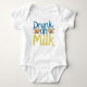 Fun cartoon of two chubby babies in orange diapers, joyfully chugging milk from bottles like a party, with bold "Drunk on Milk" text in blue and yellow. Playful, vibrant design perfect for Zazzle apparel and accessories
