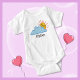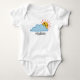 Body bébé mignon combinaison jaune heureux soleil pointant de derrière un gros nuage bleu avec un modèle ci-dessous pour ajouter votre nom, citation, texte ou supprimer pour laisser vide.