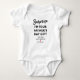 Personalized funny father's day baby bodysuit featuring the cute saying "surprise i'm your father's day gift, mom says you're welcome", a red heart, and the babys name.