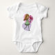 Jolie fille fantaisiste aux longs cheveux jaunes fluides et portant une robe verte et des bas rayés. Elle tient un beau bouquet de roses rouges dans ses bras tendus. Le fond est composé d'un cœur d'amour rose et violet.