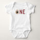 This baby one piece jumper features a bear paw print on a tree stump with rustic red words spelling out the word, "one". This baby jumpsuit is the perfect outfit for your little one's lumberjack or mountain themed first birthday celebration.