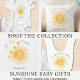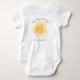 Ce body bébé mignon est décoré avec un soleil jaune souriant et "Ici vient le soleil" dans une typographie script stylée. Il est facilement personnalisable. Aquarelle originale © Michele Davies.