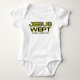 Ce costume de bébé présente un design qui présente les mots "Jésus Wept" avec le roi James Jean 11:35 écriture biblique dans un imprimé en gras avec des lettres jaunes et noires avec contour jaune et noir plus citation biblique sous ce thème religieux. Ce bodysuit est adapté de série avec un étiquette de déchirure facile plus une fermeture à trois clapets facile et une fixation à deux aiguilles sur toutes les ouvertures.