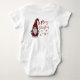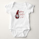 Vacances bébé de style rustique à la campagne avec "Joyeux Noël" et l'année dans un script de calligraphie rouge élégant. Ce design unique (sur le devant et sur la rive) présente un gnome dans une tenue de vacances en buffle rouge avec casquette et accentué par des étoiles de flocon de neige.