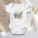 Voici notre body bébé Lapin personnalisé avec des fleurs bleues ! Avec un petit lapin tenant des fleurs sauvages bleues, un chariot en bois avec de nombreuses fleurs sauvages bleues et une petite maison à l'arrière, ce body bébé apporte charme et fantaisie à n'importe quelle pièce !