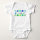 Stylish baby one piece romper, with colorful patterned elephants in two rows. Multicolorful text, between the rows of elephants, read elephant.