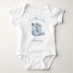 This cute baby bodysuit features a watercolor illustration of a pair of blue cowboy boots. Above, the phrase "Our little cowboy" or other text of your choice appears in blue handwriting script. Personalize with baby's name below. An ideal design fora boy's baby shower.