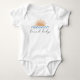 Ce jumper à une pièce est muni d'un coucher de soleil d'océan aquarelle jumelé à une police manuscrite mignonne avec les mots "bébé de plage". Cette tenue de ramponneuse à une pièce est le cadeau parfait pour une maman attenante à son baby shower ou une tenue tropicale mignonne pour votre propre petit.