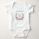 De belles pivoines roses et de la verdure sont peintes à la main avec des aquarelles et forment une couronne en fer à cheval. À l'intérieur de la couronne est le nom de votre belle petite fille écrit en écriture rose. Ci-dessus, on peut lire "Just Arrived !" dans un imprimé vert turquoise.