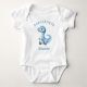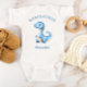 Ce body pour bébé présente une illustration aquarelle d'un bébé dinosaure bleu. Au-dessus, le mot "BABYSAURUS" apparaît en texte bleu. Personnalisez avec le nom du bébé ci-dessous. Un design idéal pour une baby shower de garçon.