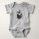 Un petit costume de bébé gris mignon, avec illustration graphique d'une poche gris foncé avec un chiot carlin à l'intérieur. Carlin de poche en texte graphique décore la fausse poche.