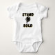 Ce costume de bébé a un design qui affiche les mots "Stand Bold" dans une police d'impression en gras avec lettre noire sur une ombre dorée avec une icône de tête de lion noir et or au centre dans ce thème de citation biblique basée sur la foi. Ce bodysuit est adapté de série avec un étiquette de déchirure facile plus une fermeture à trois clapets facile et une fixation à deux aiguilles sur toutes les ouvertures.