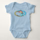 Jumping Rainbow Trout Fly Fishing Baby Bodysuit. Parfait pour ce futur pêcheur à la mouche (ou femme) ! La truite saute d'un jet d'eau bleu pour mordre un petit leurre à la cravate de mouches. L'Arrière - plan est ovale, fait de taches de truite, mais dégradé, recouvert d'une crème bleue et foncée.