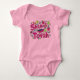 Un beau costume rose pour bébé célébrant Rosh Hashanah a pour légende "Shana Tova" dans une police rose foncé et vivante avec 3 pommes vertes. La combinaison du tissu et des pommes colorées crée un design joyeux et attrayant, parfait pour marquer le séjour avec style et gaieté.